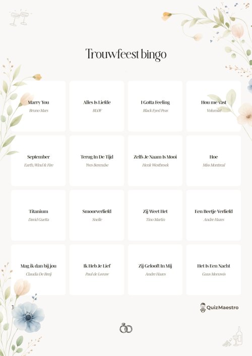 Stel je eigen Muziekbingo samen! Jij kiest de nummers, en wij zorgen voor de rest. Perfect voor bedrijfsfeesten, verjaardagen of bruiloften. Binnen enkele dagen ontvang je een e-mail met alles dat je nodig hebt voor jouw muziekbingo!