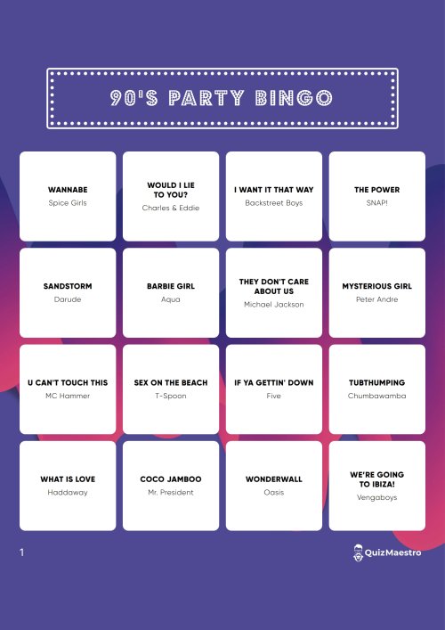 Je speelt de 90's Party Bingo eenvoudig via Spotify af. Je hebt hier geen abonnement voor nodig, al is het wel handig als je Spotify premium hebt. Dit zijn 10 nummers die je kunt verwachten.