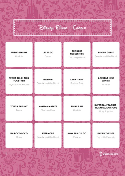 Herbeleef je favoriete Disney-momenten terwijl je luistert naar de meest geliefde nummers uit de magische Dinsey films. Deze muziekbingo bevat alle Engelse Disney Hits. Wil je deze bingo liever spelen met Nederlandse nummers? Klik dan hier.