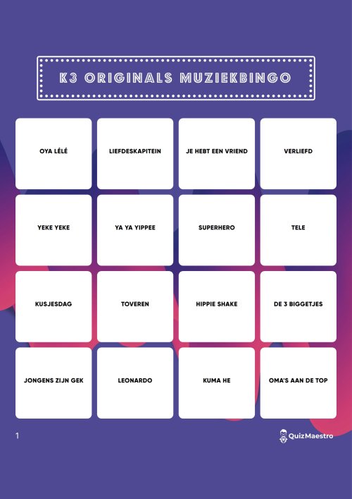 Herbeleef de magie van de originele K3 met deze vrolijke K3 Muziekbingo vol herkenbare klassiekers. Van Oya Lélé tot Tele-Romeo en Heyah Mama – elk nummer brengt je terug naar de tijd van glittertopjes, regenboogjurkjes en eindeloos meezingen. Perfect voor een meidenavond, familiefeest of nostalgisch avondje met vriendinnen.