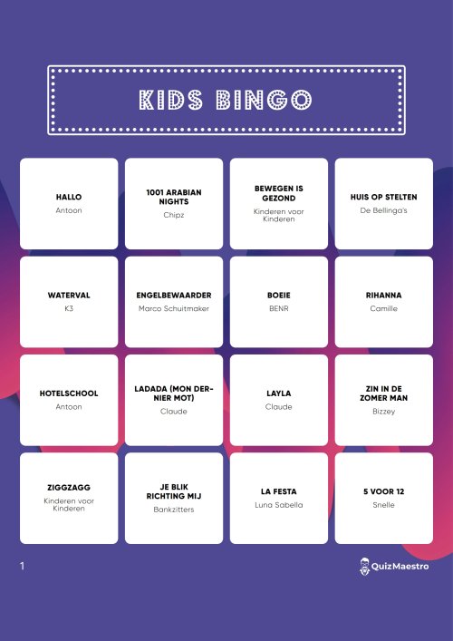 Ben je op zoek bent naar een originele activiteit voor kinderen? Kies dan voor de Kids Muziekbingo. Deze muziekbingo bestaat uit liedjes die herkenbaar zijn voor kinderen. In deze muziekbingo vind je alleen Nederlandstalige nummers die bijvoorbeeld ook in de Zapp Kids Top 20 voorbij zijn gekomen. Kortom: een leuke activiteit voor kinderen.