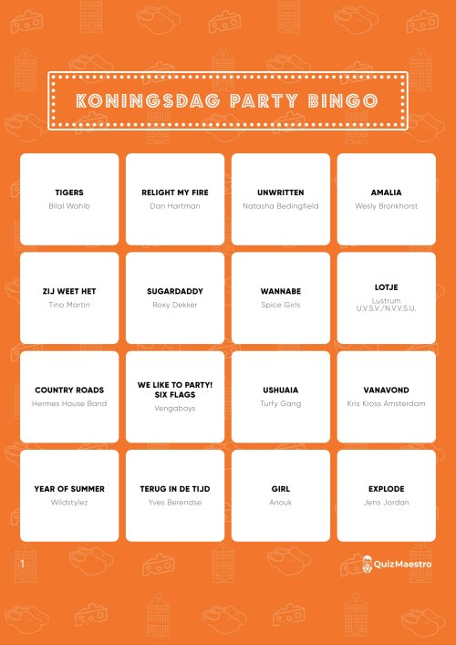 Je speelt de Koningsdag Party Bingo eenvoudig via Spotify af. Je hebt hier geen abonnement voor nodig, al is het wel handig als je Spotify premium hebt. Dit zijn 10 nummers die je kunt verwachten.