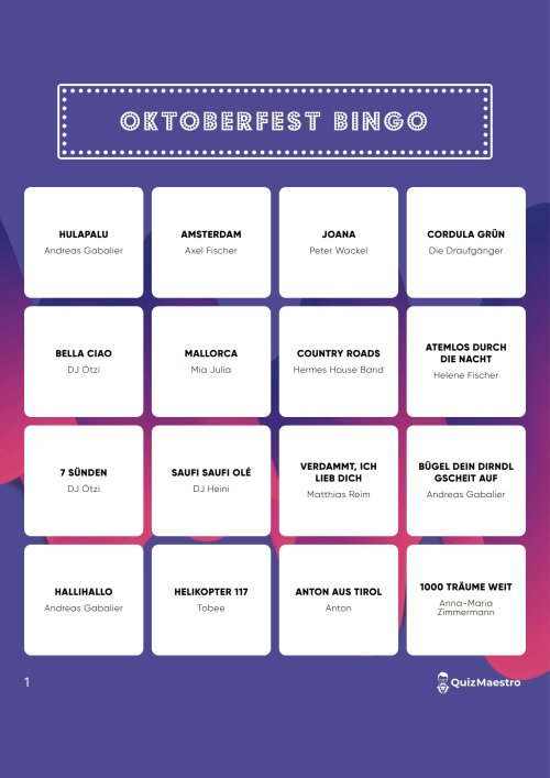 Ja, sicher! Bier & bingo is een perfecte combinatie! In deze muziekbingo vind je alleen maar Duitse partyhits! Ideaal om in de stemming te komen voor het Oktoberfest. Je kunt deze muziekbingo natuurlijk ook bestellen als je zin hebt in een lekker Duits feestje!