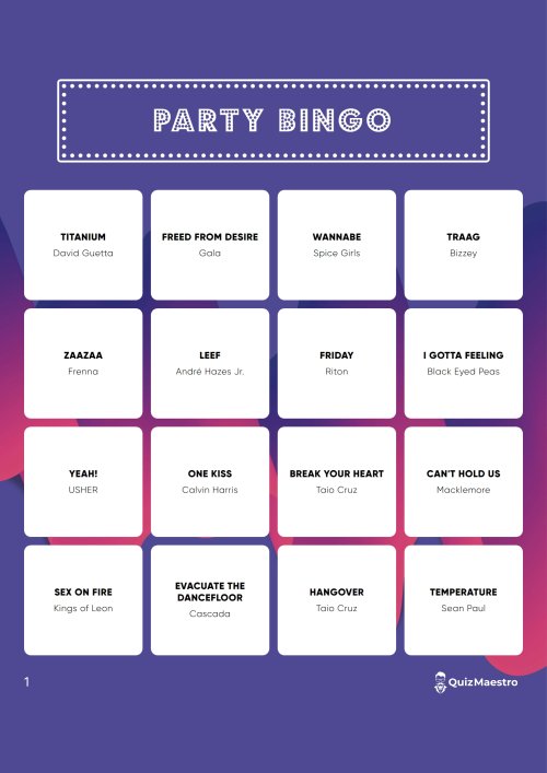 Ken je dat gevoel: je bent opstap, je bent gezellig aangeschoten en de DJ draait de ene na de andere party hit. Heerlijk toch!? Nou in deze muziekbingo hoor je alleen maar party hits. Sommige nummers luister je normaal gesproken niet, maar als je ze dan hoort ga je los! Ken jij alle nummers? Wie weet heb jij dan wel bingo!