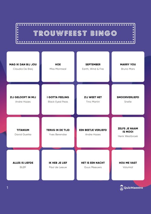 Op zoek naar de perfecte manier om het trouwfeest op gang te brengen? Deze muziekbingo zit vol met prachtige Nederlandse liefdesliedjes en knallende partyhits! Een gegarandeerde sfeerbooster waarbij iedereen meezingt, danst en misschien zelfs een beetje vals bingo roept. Laat de liefde en het feest maar losbarsten!
